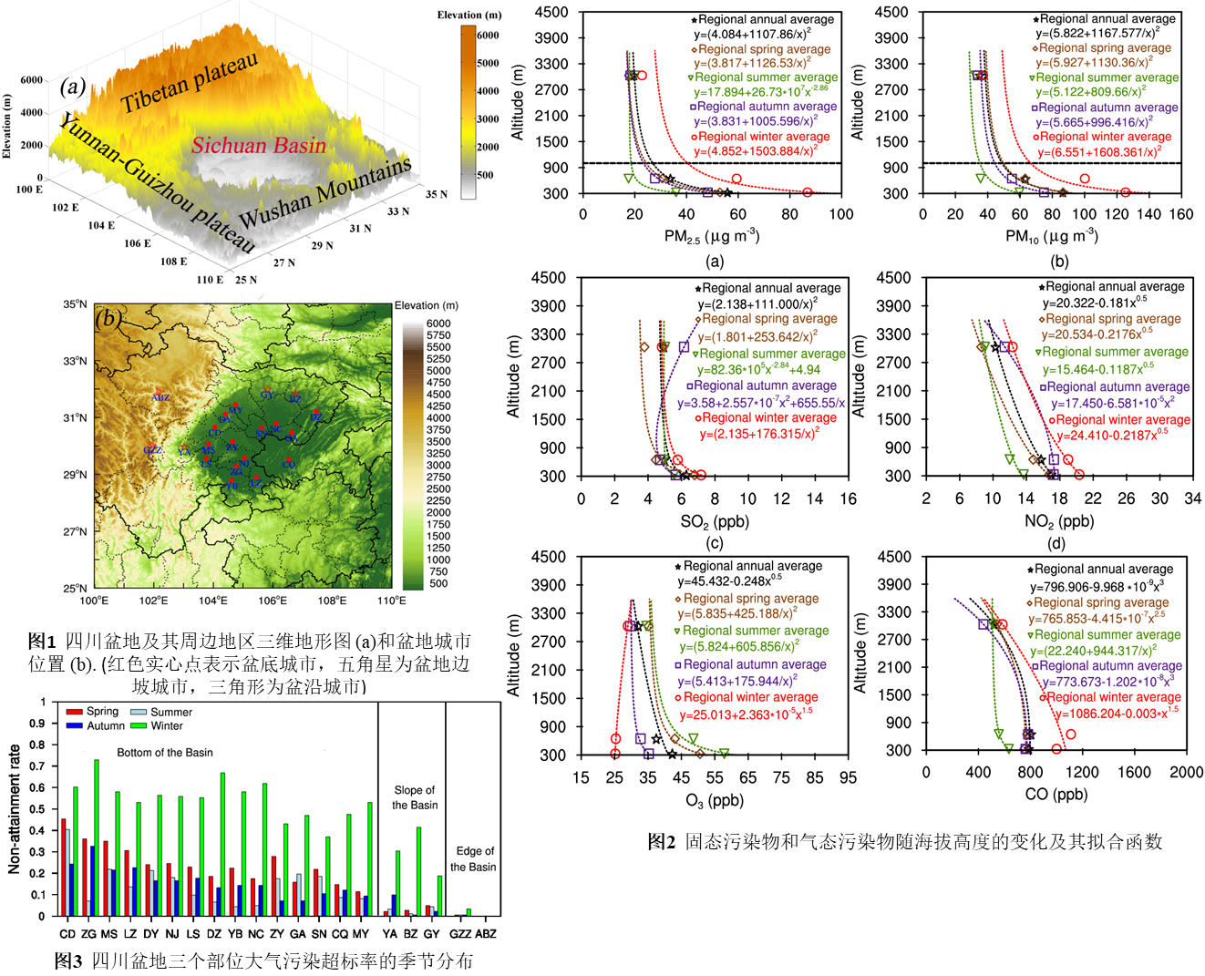 该论文选取四川盆地20个城市并按照地形特征将其分成盆底、边坡和盆沿三个部位(图1)。分别探究盆地三个部位的2015-2016年污染特征,并对不同季节的6种大气污染物浓度随海拔高度的变化进行拟合(图2)。结果表明PM浓度随海拔高度的变化能够用一种非线性函数y=(a+b/x)2表征,这种非线性函数可以反映盆地PM浓度的垂直变化,表明,高浓度的颗粒物主要集中在盆底的边界层内;4种气态污染浓度随海拔高度的变化表明,气态污染物随海拔高度的变化具有多样性,其更为复杂,不能用一种固定的函数形式进行拟合,同一种污染物浓度在不同的季节,有的随海拔高度增加,有的减小。该项工作能够用于反映盆地内颗粒污染物的垂直分布,弥补了当地缺乏常规大气污染垂直监测的不足。