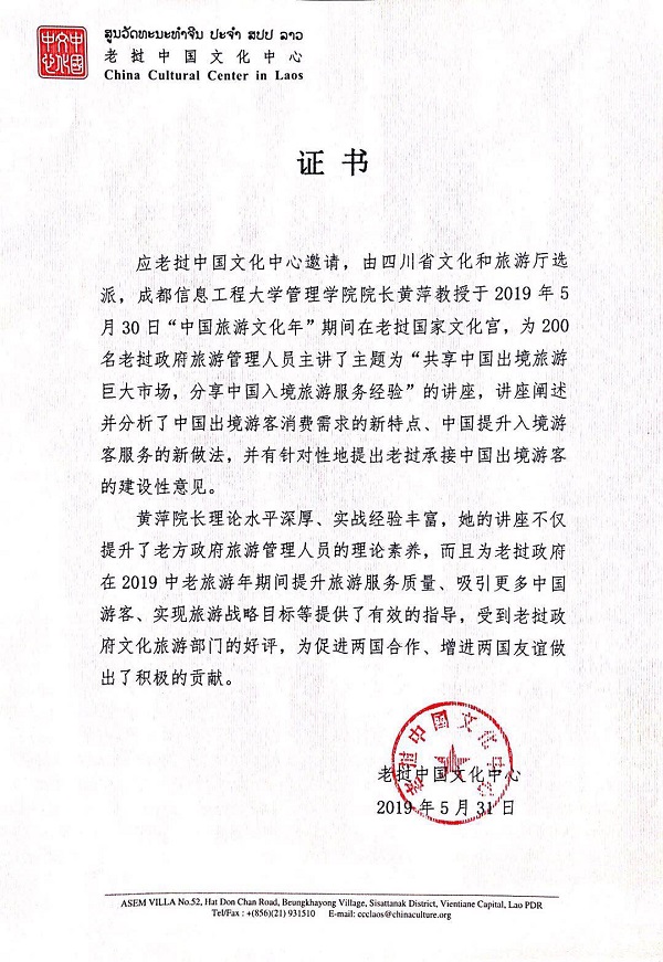 【本网讯】应老挝中国文化中心邀请,由四川省文化和旅游厅选派,我校管理学院院长黄萍教授与四川旅游规划设计研究院设计所顾相刚所长作为四川旅游业界的专家代表,于5月30日在老挝举办的“中国旅游文化周”期间,为200名老挝政府旅游管理和从业人员做了旅游文化产业发展的专题讲座。黄萍讲授的题目是“共享中国出境旅游消费大市场,分享中国入境旅游管理好经验”。