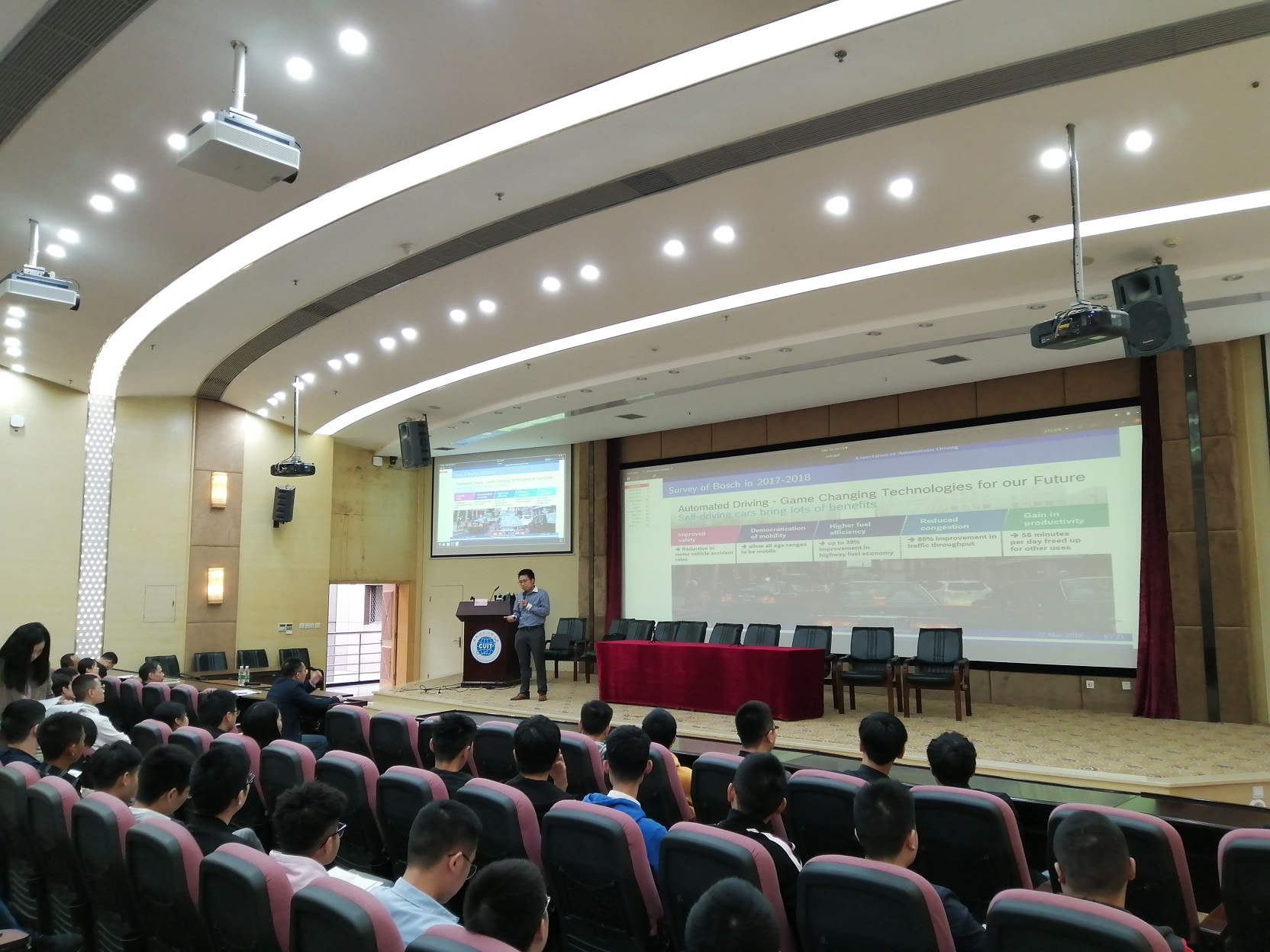【本网讯】10月14日上午,应控制工程学院机器人与智能系统国际联合研究院的邀请,松下汽车欧洲ADAS负责人Nguyen Van Duong博士在国际会议厅举办了题为“From ADAS to Autonomous Driving Recently”的学术讲座。本次讲座由控制工程学院院长蒋涛和周楠老师共同主持,控制工程学院一百余名师生参加了讲座。