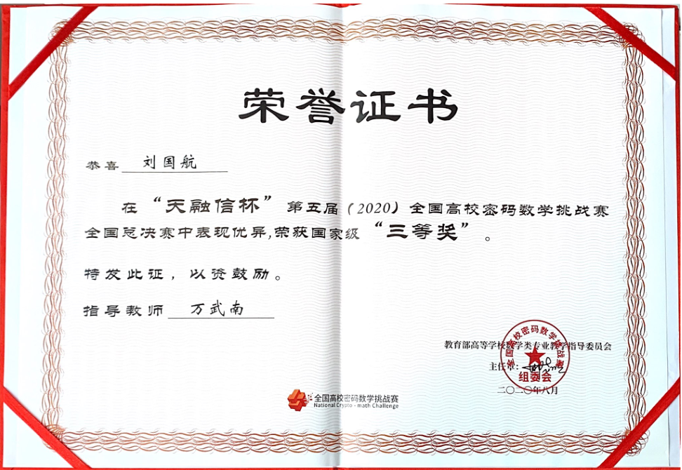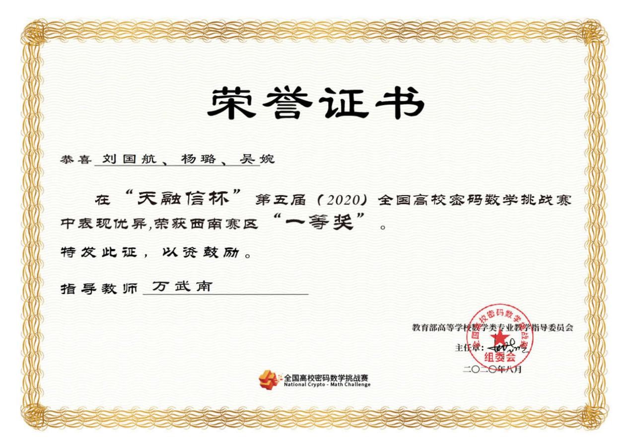 近日,由教育部高等学校数学类专业教学指导委员会、天融信科技集团联合主办的“天融信杯”第五届(2020)全国高校密码数学挑战赛总决赛圆满落幕。云博体育网络空间安全学院的“三只松鼠”战队荣获西南赛区一等奖、国家级三等奖。