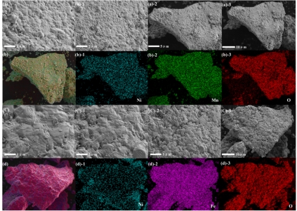 图2反应后载氧体表面结构和元素分布(a) NiMn2O4(b) NiFe2O4