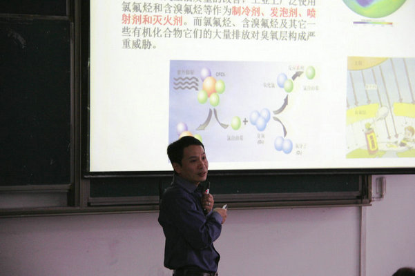 杨怀金首先问同学们今天是个什么重要的日子——国际臭氧层保护日,并以此展开话题,给同学们讲解了臭氧层的重要性,臭氧层可以吸收对人体有害的紫外线,臭氧层被破坏,会给人类带来巨大的危害。在讲座中,杨怀金也给同学们介绍了国际臭氧层保护日的由来,也从微观和宏观两方面介绍了臭氧,并告诉同学们在日常生活中使用的制冷剂、发泡剂、喷射剂、灭火剂等都含有能破坏臭氧层的化学物质,在使用时应该注意。最后,杨怀金讲到,同学们应该记住今天所讲的知识,并告诉身边的人,保护臭氧层,保护地球的保护伞。