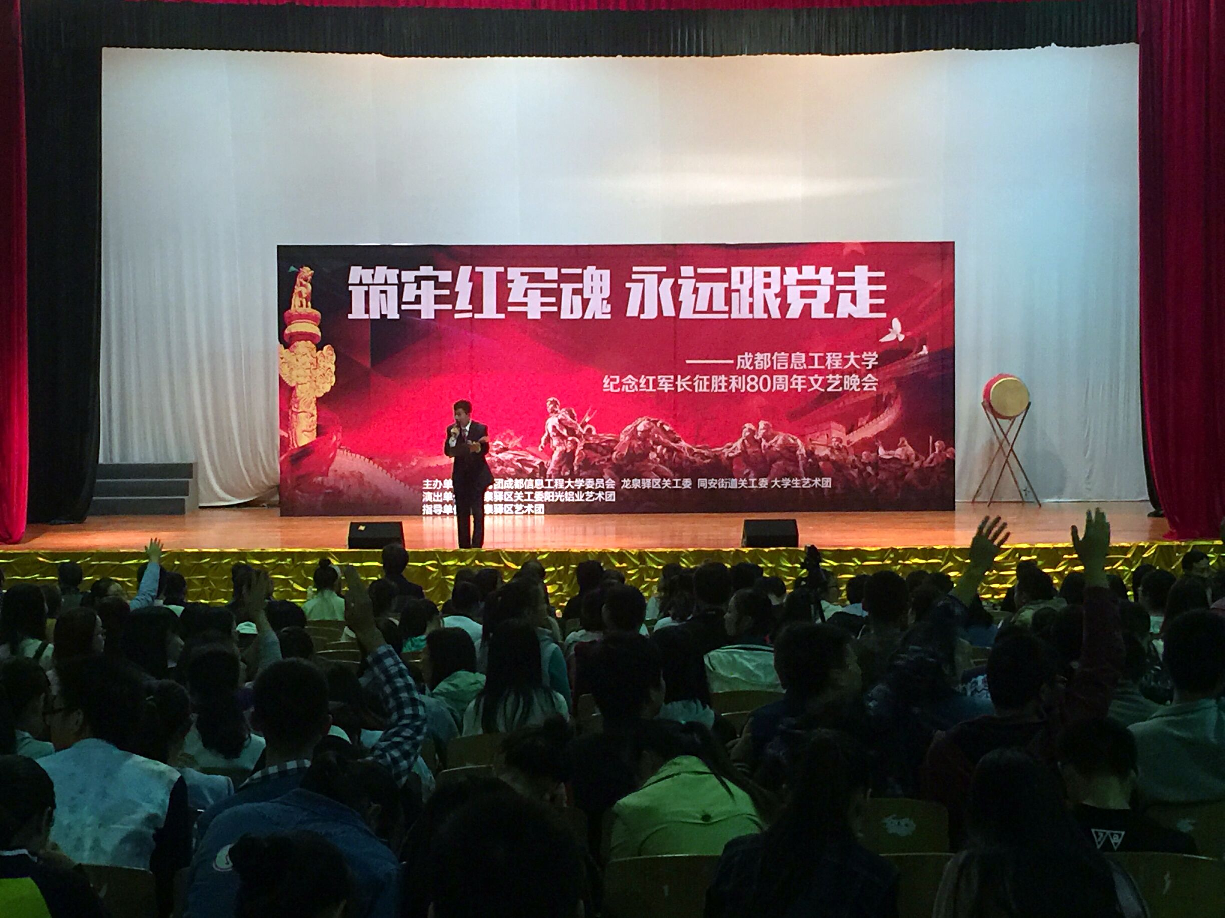 【本网讯】今年是中国共产党成立95周年,也是中国工农红军长征胜利80周年。11月27日,纪念红军长征胜利80周年文艺晚会在我校龙泉校区大礼堂举行。本次活动由我校团委与龙泉驿区关工委联合主办,龙泉驿区关工委副主任张世香、学校团委负责人及各学院1500名学生代表共同观看演出.