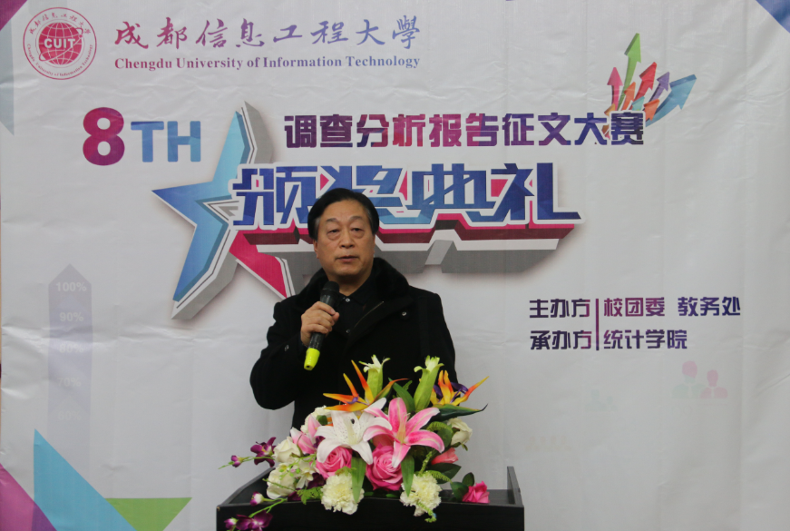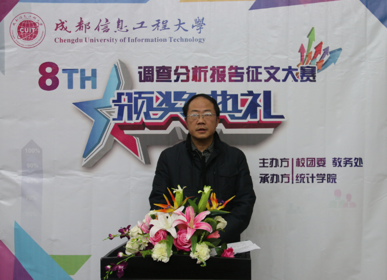 马义华致辞并回顾了本届赛事情况,他提到,调查分析报告征文大赛做为学校科技节的首批竞赛项目,至今已经开展了八届。本届赛事启动早、准备足、学生参与面广,共有来自大气科学学院、资源环境学院、通信工程学院、应用数学学院、商学院、管理学院、物流学院、统计学院等8个学院的42支队伍,近200人报名参加。承办方组织了由五位教授组成的评审工作组,阵容强大,评审专业。本届赛事的成功举办,提高了参赛学生理论联系实际,发现、分析、解决现实问题的能力,希望下一届赛事能有更多的学生参与进来。