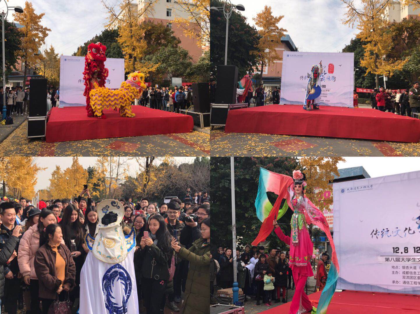 【本网讯】12月8日中午,第八届大学生文化艺术节传统文化“艺”条街活动在我校航空港校区银杏大道举行。本次活动由学校团委、双流团区委主办,通信工程学院承办。校团委负责人,部分学院院长、总支书记(副书记)、团委书记,学校部分教职工与近2000名成信学子参加了活动。