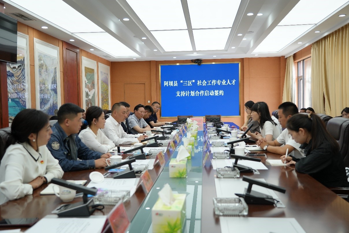 8月29日上午,在阿坝县委社会工作部的支持下,云博体育社会工作服务团队与成都市同行社会工作服务中心,在阿坝县举行“三区”社会工作专业人才支持计划合作签约仪式,阿坝县委常委、政法委书记、县委社会工作部部长彭光明参加签约仪式,签约仪式上,彭光明书记代表县委社会工作部做了发言,随后我校伍娟副教授进行发言。